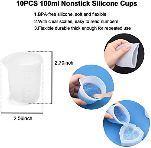Wat je krijgt: 10 stuks herbruikbare siliconen bekers voor hars (100 ml), gladde, duurzame antiaanbaklaag, flexibele behuizing en schenktuit voor harskunst, genoeg om aan je verschillende behoeften te voldoen.